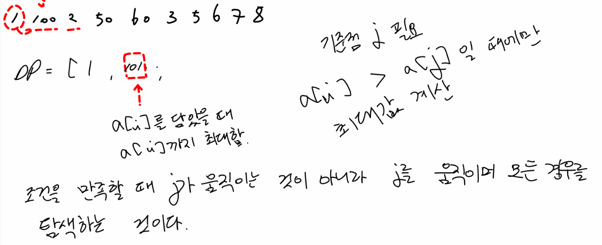 - 증가하는 부분수열 중 합이 가장 큰 것을 찾아야한다. 증가하는 수열 중 어떤 선택을 할 때 다음에 올 수 있는 요소들에 영향을 미치므로 DP를 활용한다.