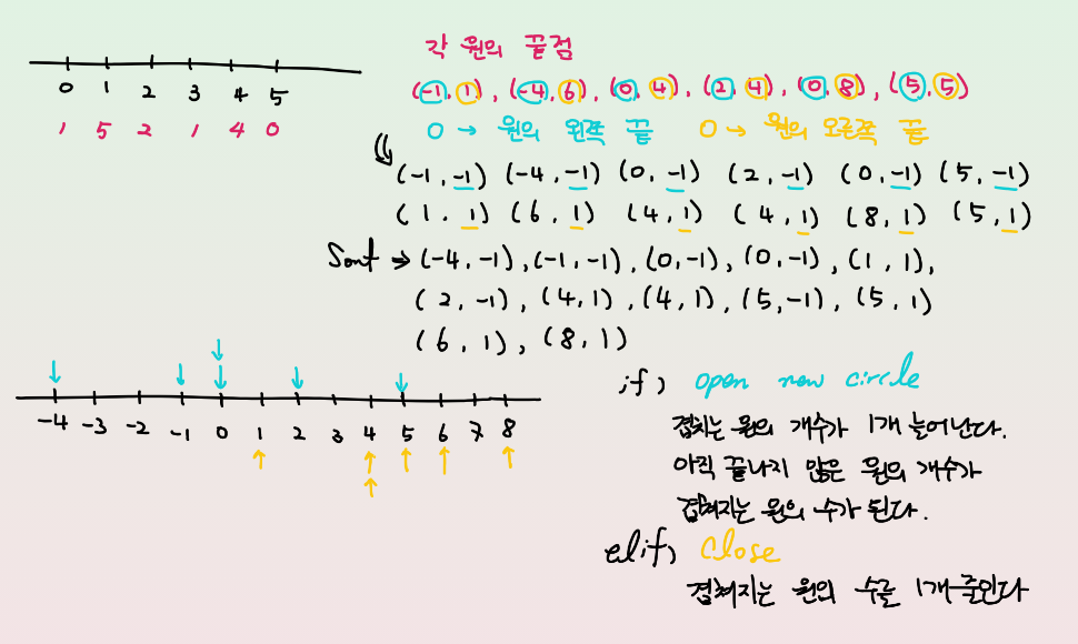 - 풀이를 구글링했지만 이해하기 매우 난해했다. 어려웠던 부분은 설명이 없고 변수명만 존재하여 코드를 해석하기 어려웠는데 포인트는 새로운 원이 열릴 때에는 기존에 열려있던 원들과 겹치는 부분이 생기므로 총 쌍에서 더해준다. 닫힐 때에는 열려있는 원만 하나 닫아주면 되므로 결국 포인트는 새로운 원이 열리는 지점을 관찰하는 것이었다.