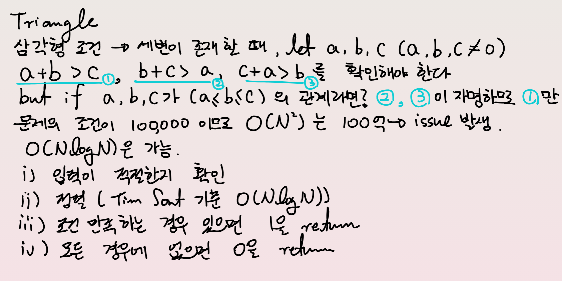 - 헷갈렸던 부분은 전수 조사를 해야하는가의 문제이다. 예를 들어, 1 2 4 7 8 의 경우에서, 1 2 4 나 2 4 7의 경우 삼각형이 되지 않는다. 하지만 2 7 8 의 경우 삼각형이 되어서 그런 부분을 검색하려면 다시 O(N^2)~O(N^3)이 되는 것이었다. 하지만 결국 4 7 8 에서 되는 경우가 생기므로 저렇게 풀이해도 가능하다.