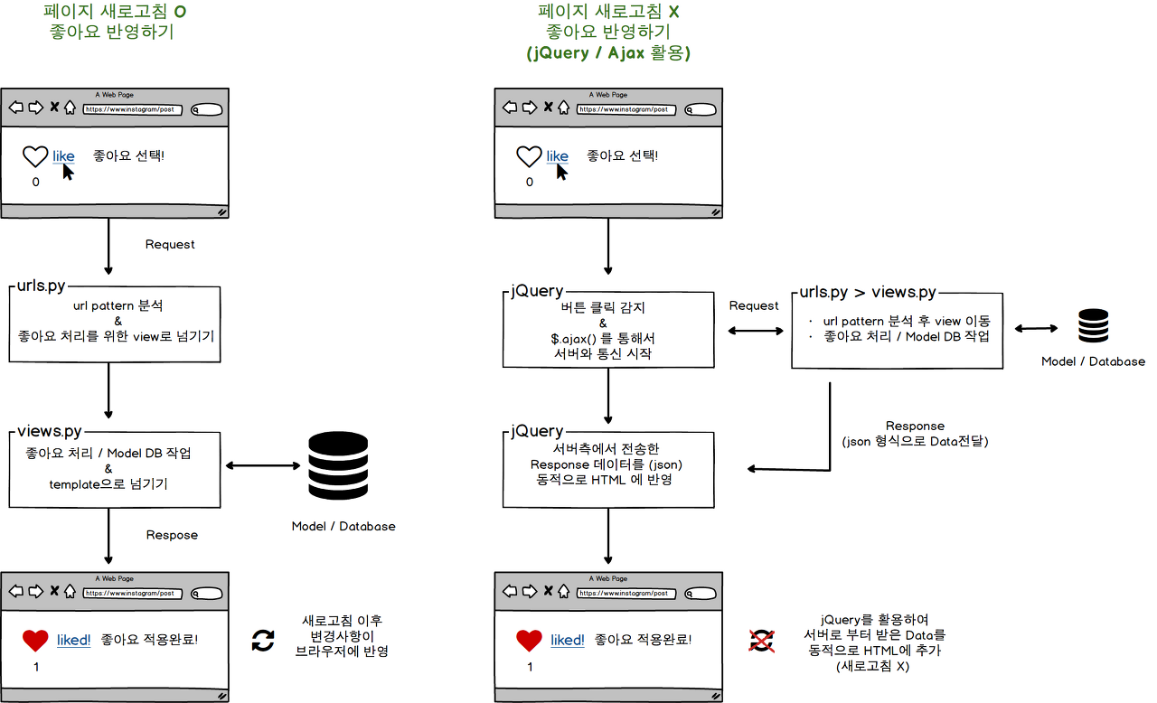 - 왼쪽 방식은 AJAX를 사용하지않는 것으로 Request가 들어오면 url로 href 되어 views.py에서 models.py의모델 내용을 변경하고, 변경사항을 반영하는 템플릿으로 다시 redirect해준다. 이 과정은 새로고침으로 볼 수 있다.