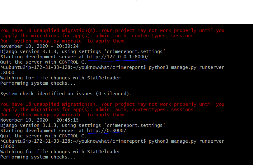 - port가 localhost로 잡혀 보안 이슈가 발생하여 실행이 되지 않았다. local로 작업할 때 처럼 단순히 runserver 하는 것이 아니라 runserver 0:8000로 port를 직접 잡아 주어야한다.