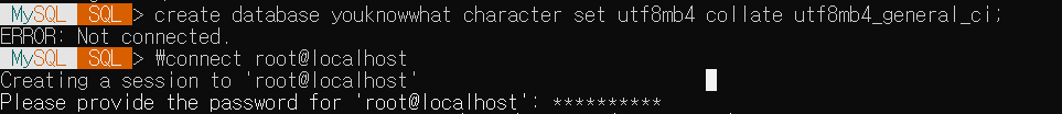- MySQL shell은 시작이 JS이므로 \sql 명령어를 통해 SQL로 전환해준다