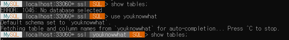 - 바로 show tables를 하면 오류가 발생한다. use 명령어를 통해 먼저 사용할 db를 지정해준 후 사용 가능하다.