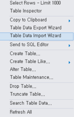- MySQL workbench의 원하는 테이블을 지정하여 마우스 우클릭을 하면 위의 화면이 나오고 Table Data Import를 진행한다