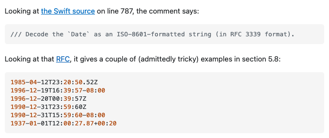 Swift의 경우 RFC3339 포맷에서 ISO-8601 포맷을 따르기 때문에, 위에 나오는 예시의 Date 타입을 변환할 수 있어요.