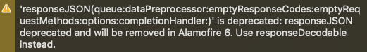 responseJSON이라는 메서드가 deprecated 되었다는 메시지였어요. 심지어 Alamofire 6에서 없어질 거라는 메시지였죠. 그래서 메시지에서 추천하는 대로 responseDecodable을 쓰기 위해 문서를 검색했어요.