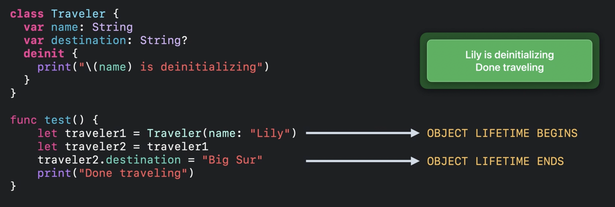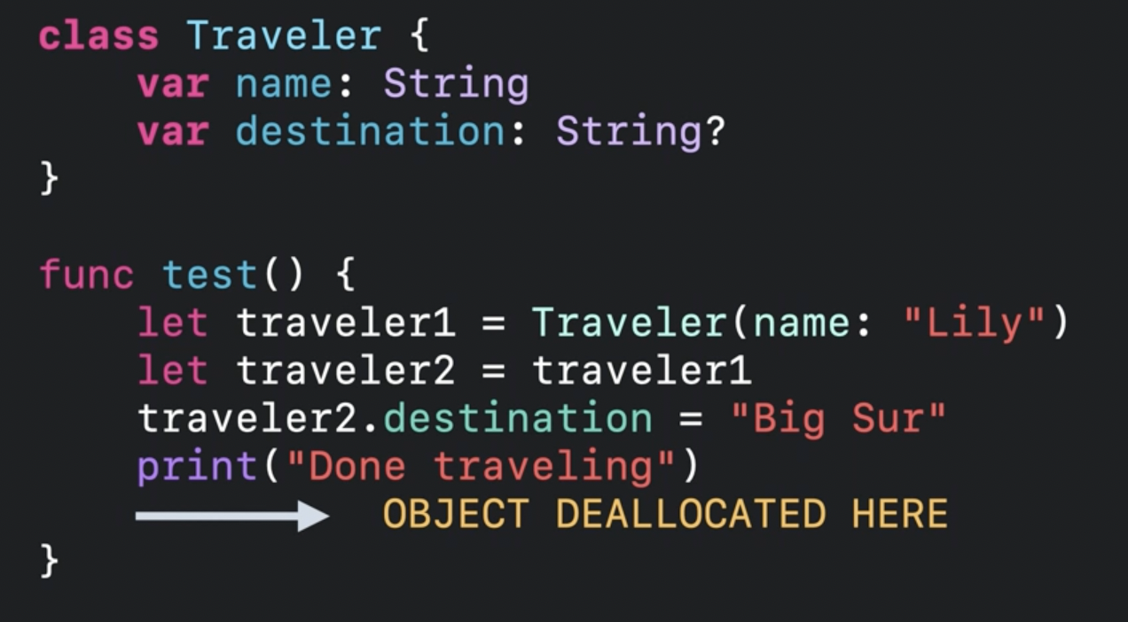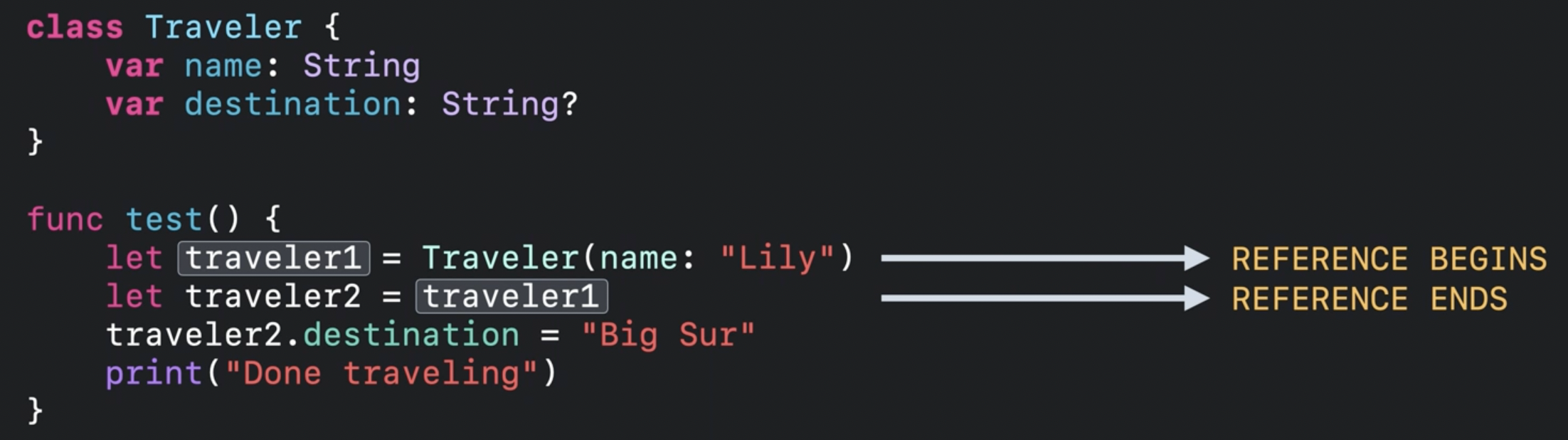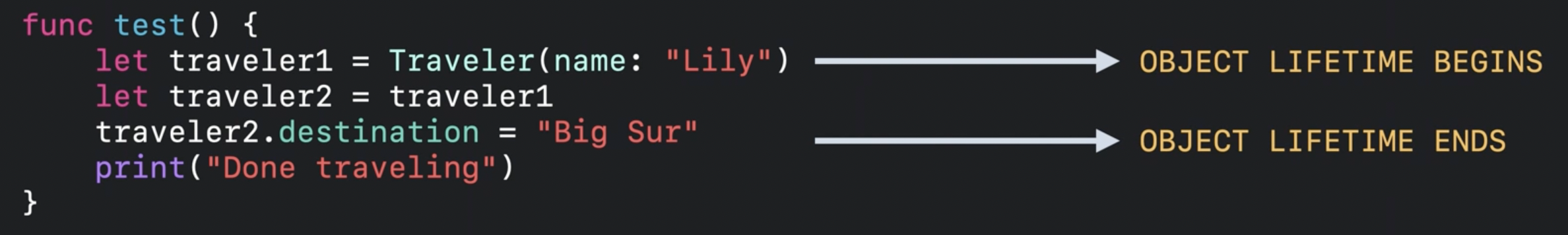 위의 내용을 정리하면 결국 Traveler라는 참조 타입 객체는 init으로 생명주기를 시작하고, 더 이상 사용이 되지 않는 시점에 생명 주기가 멈춰요. 이것을 Object의 lifetime이 use-based(사용성 중심)로 동작한다고 해요.