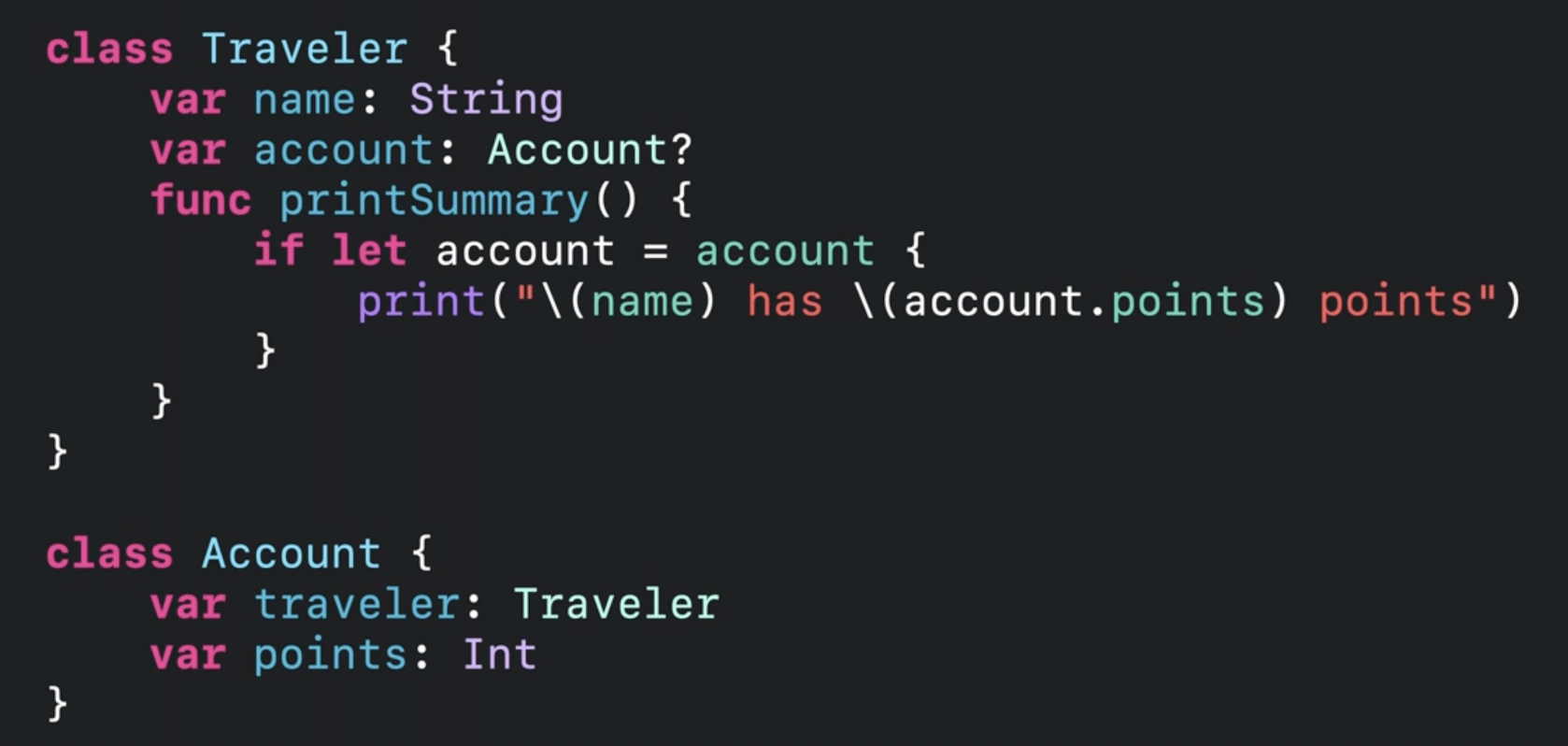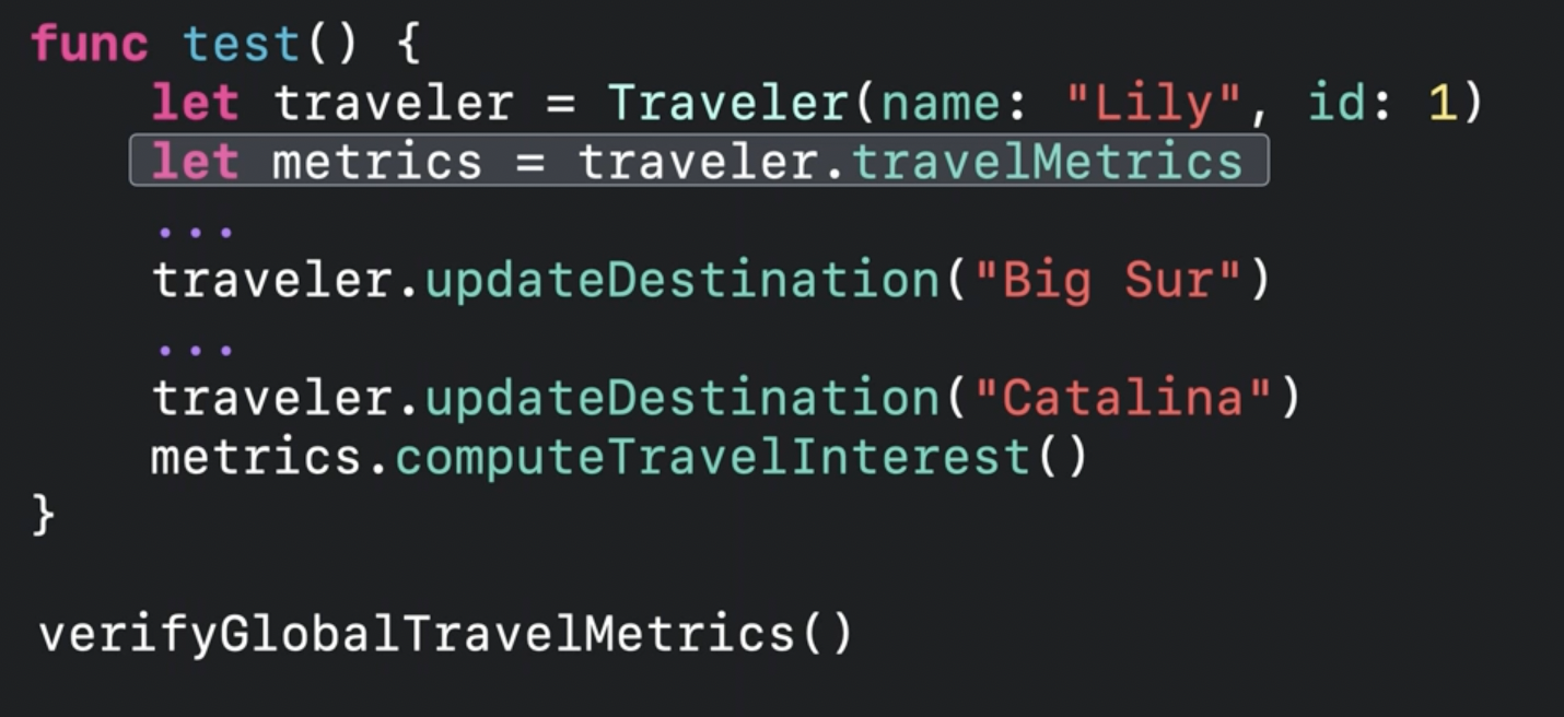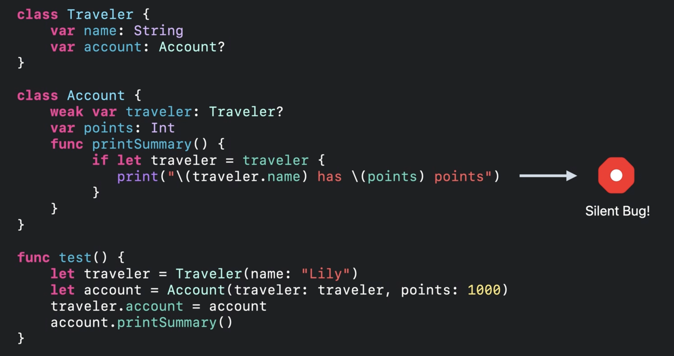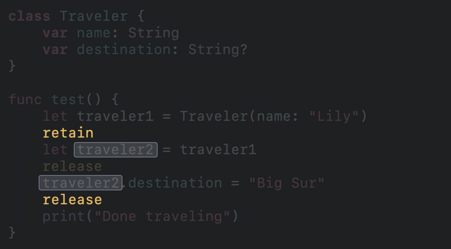 하지만 traveler.updateDestination("Catalina") 작업이 끝나는 동시에 Traveler의 사용이 끝나게 되고, ARC가 release를 metrics.computeTravelInterest() 전에 실행시키면 metrics는 이미 할당 해제된 traveler를 관찰하고 있기 때문에 카테고리는 nil이 될 거예요.