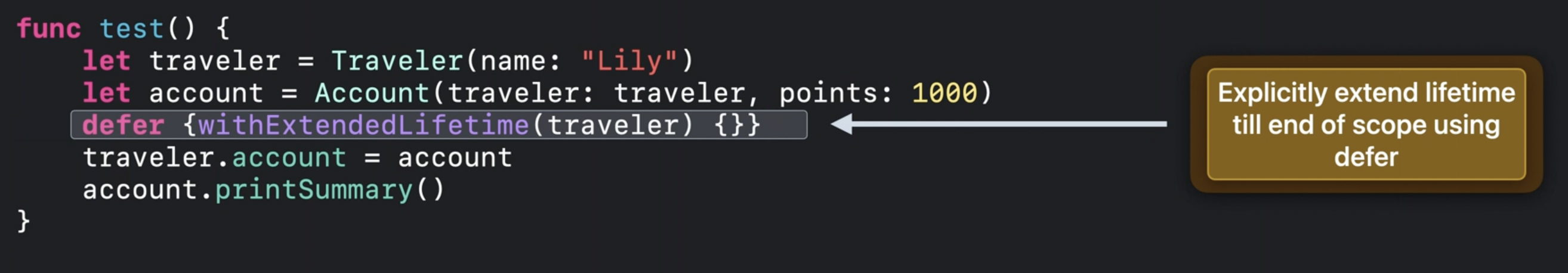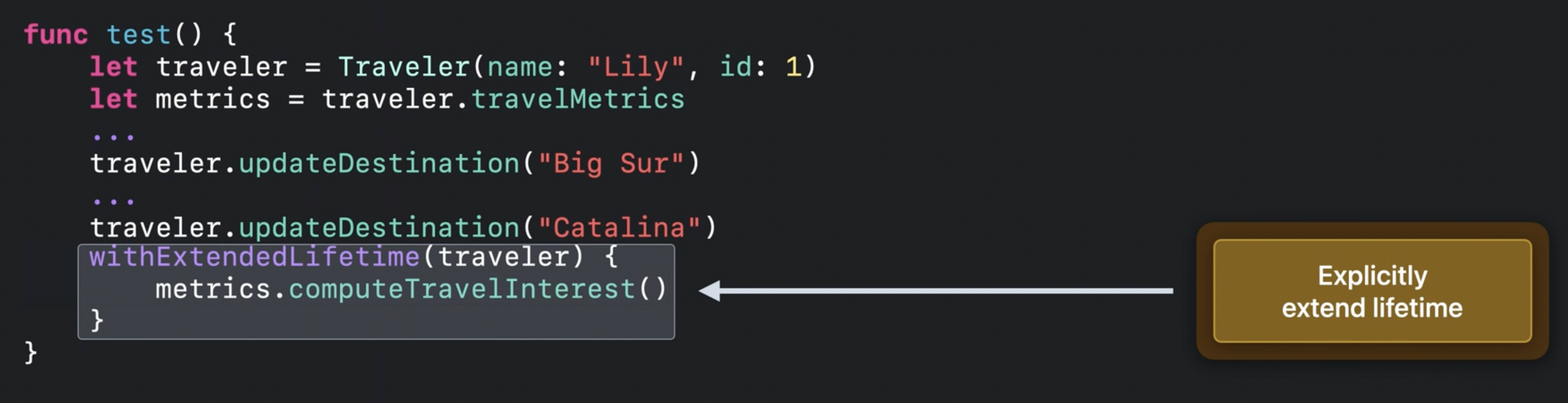 withExtenedLifetime 메서드를 통해 traveler 객체의 lifetime을 안전하게 연장할 수 있어요.