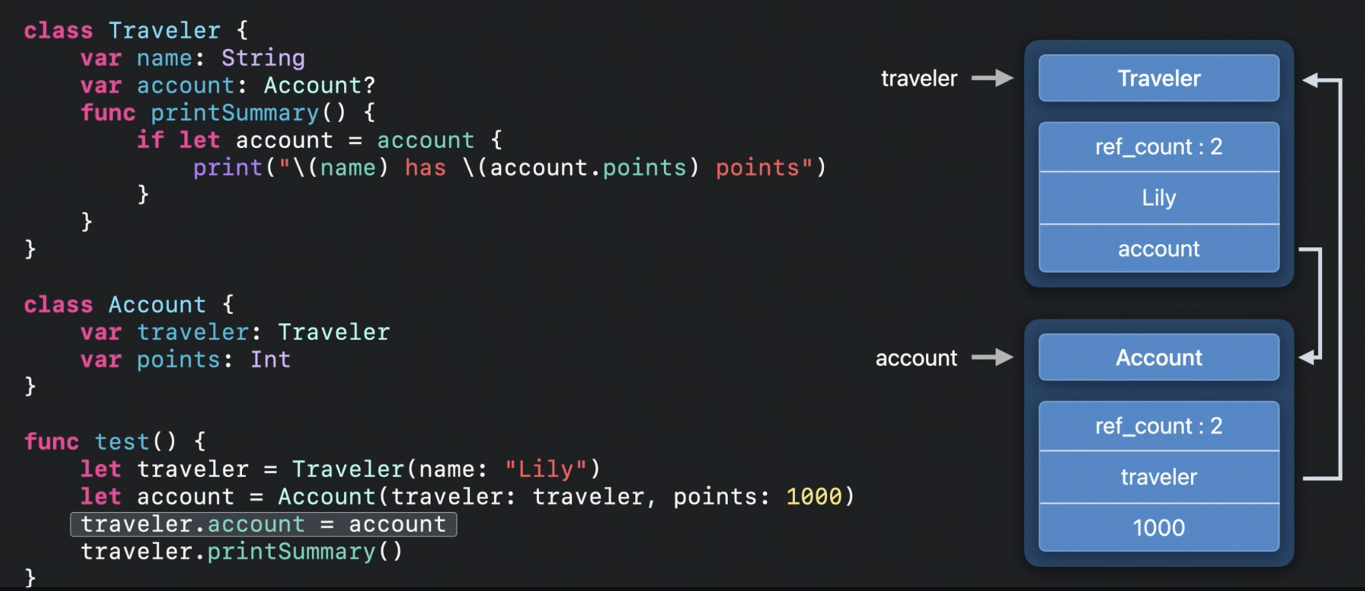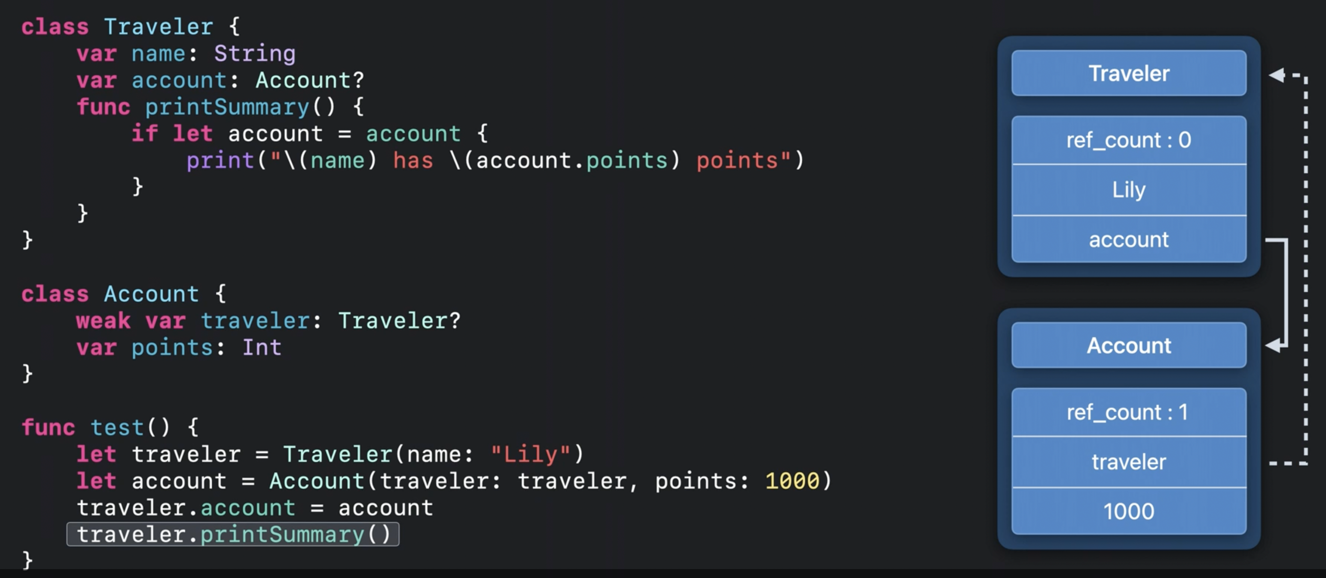 아까와 다른 것이 Account 객체 내에서 traveler가 weak로 선언되었어요.