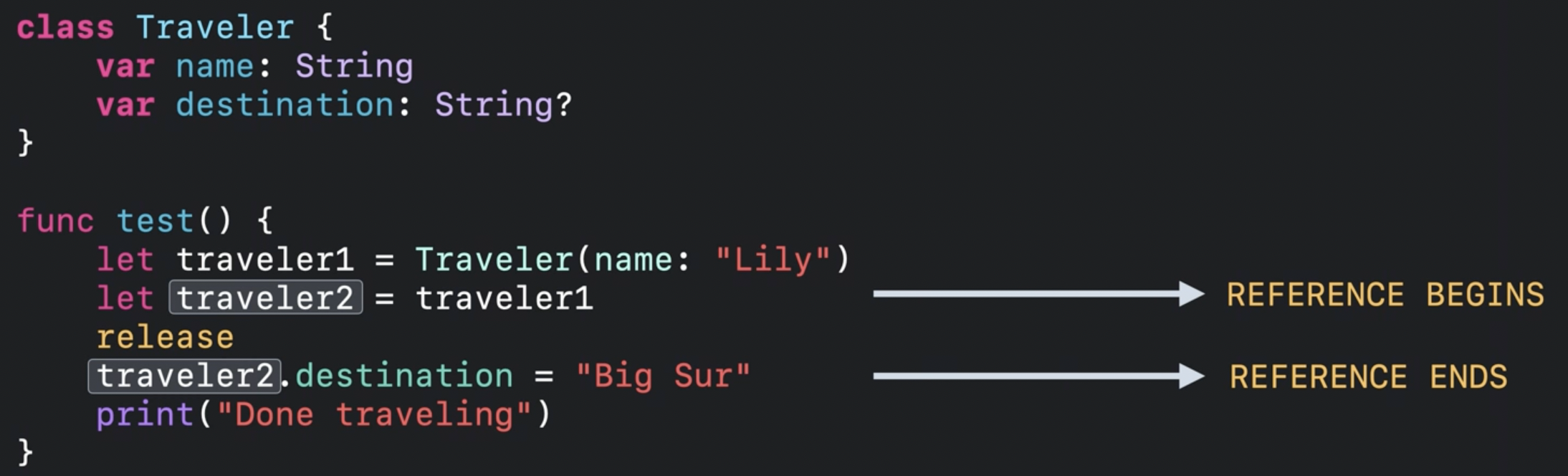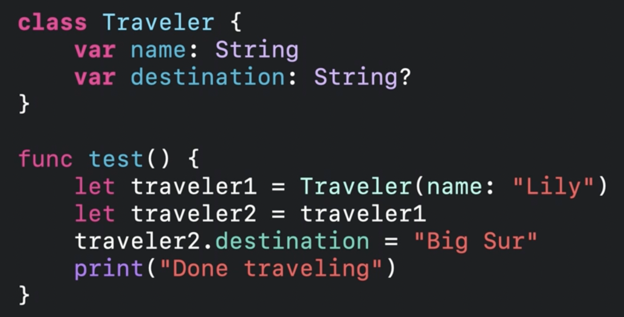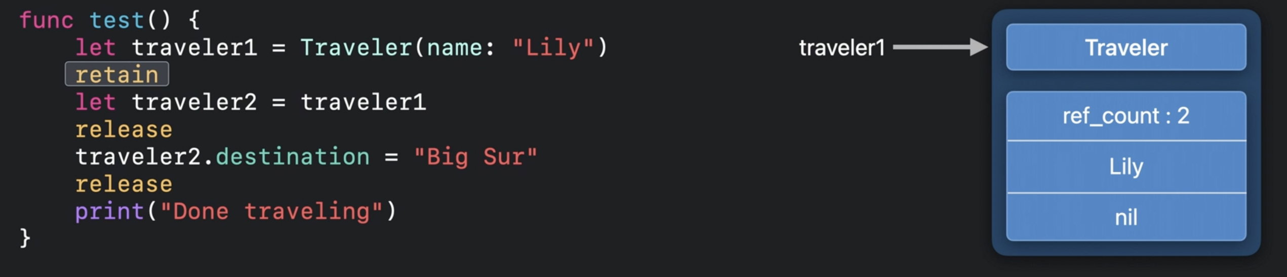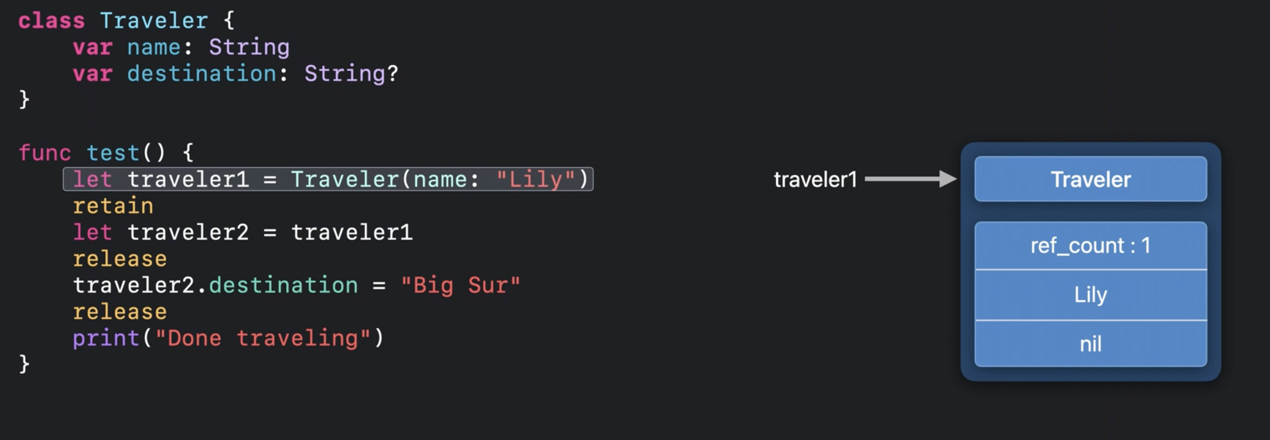 traveler1은 인스턴스가 init 되는 시점에 참조가 시작되고, traveler2로 복사가 끝나면 더 이상 사용되는 일이 없기 때문에 참조가 끝이 나요.