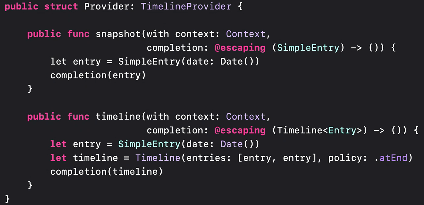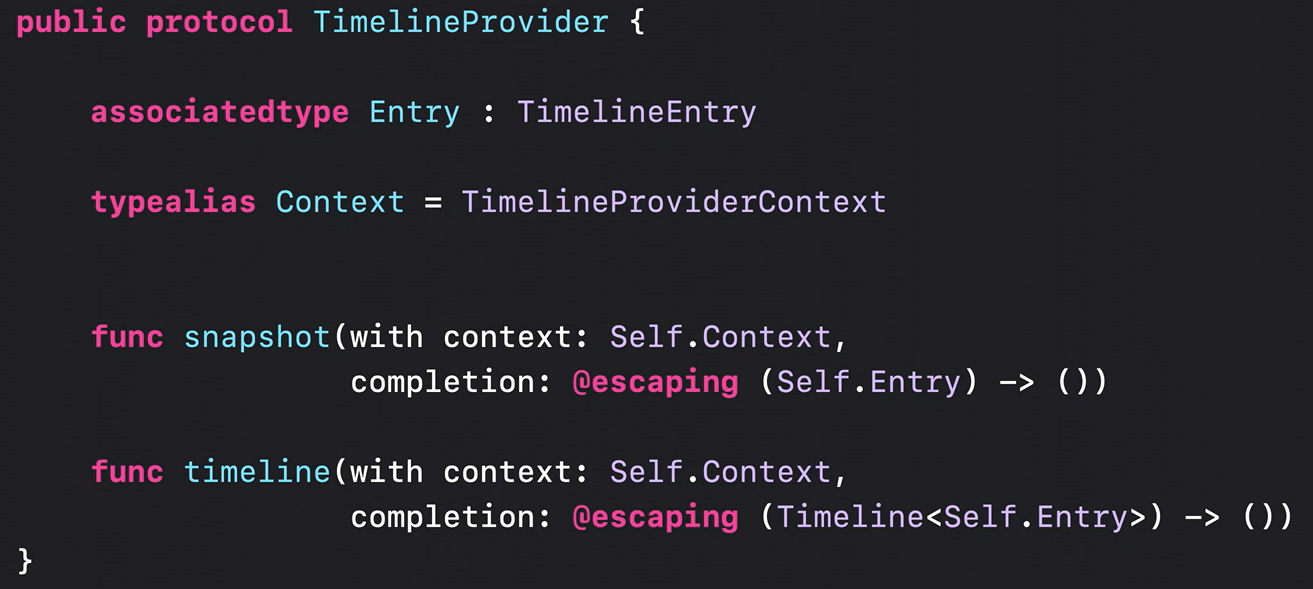 TimelineProvider라는 프로토콜은 위와 같이 구성되어 있어요.