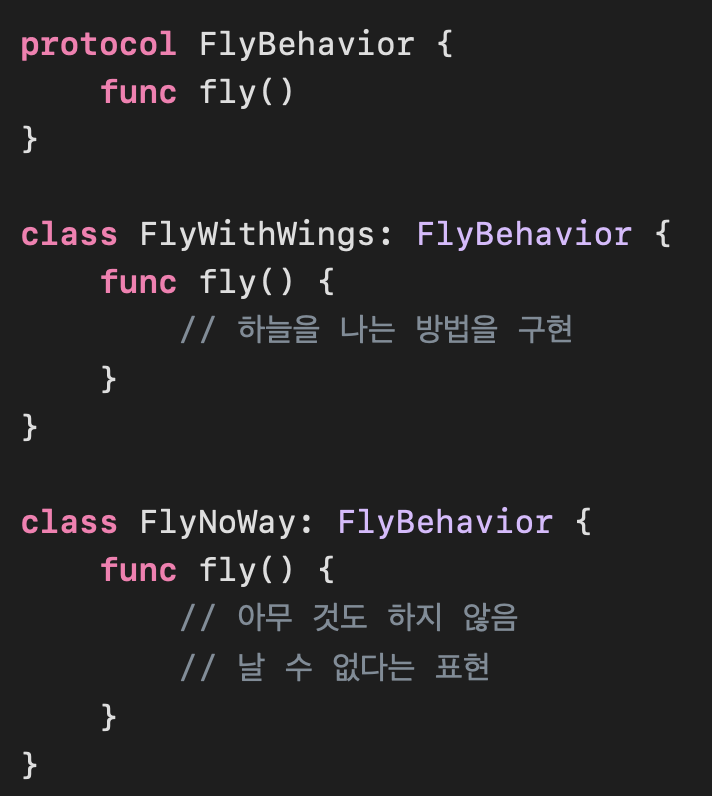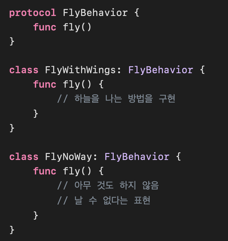 ์์ ๋ฐฉ๋ฒ 1์์ ๊ตฌํํ fly() ๋ฉ์๋๋ฅผ Duck ํด๋์ค์์ ๋นผ๊ณ Flyable์ด๋ผ๋ Protocol์ ๋ง๋ค์ด์ ์ฑํํ๋ ๊ตฌ์กฐ๋ก ๋ง๋ค์ด์.