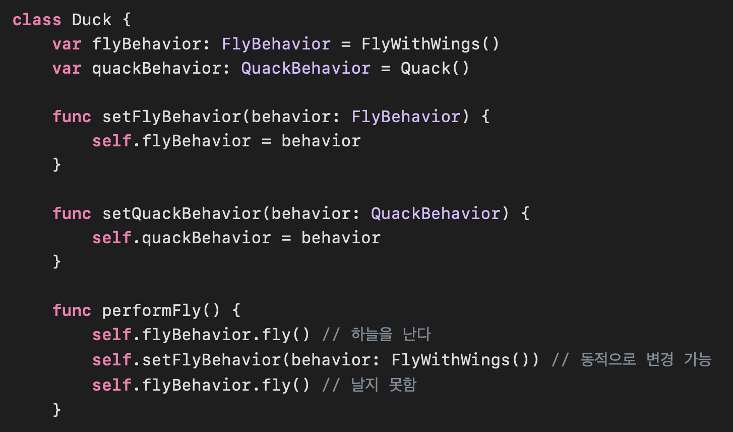 ํ๋(Behavior) ์ธํฐํ์ด์ค๋ Duck ํด๋์ค๊ฐ ์๋๋ผ ํ๋ ํด๋์ค์์ ๊ตฌํํด์.