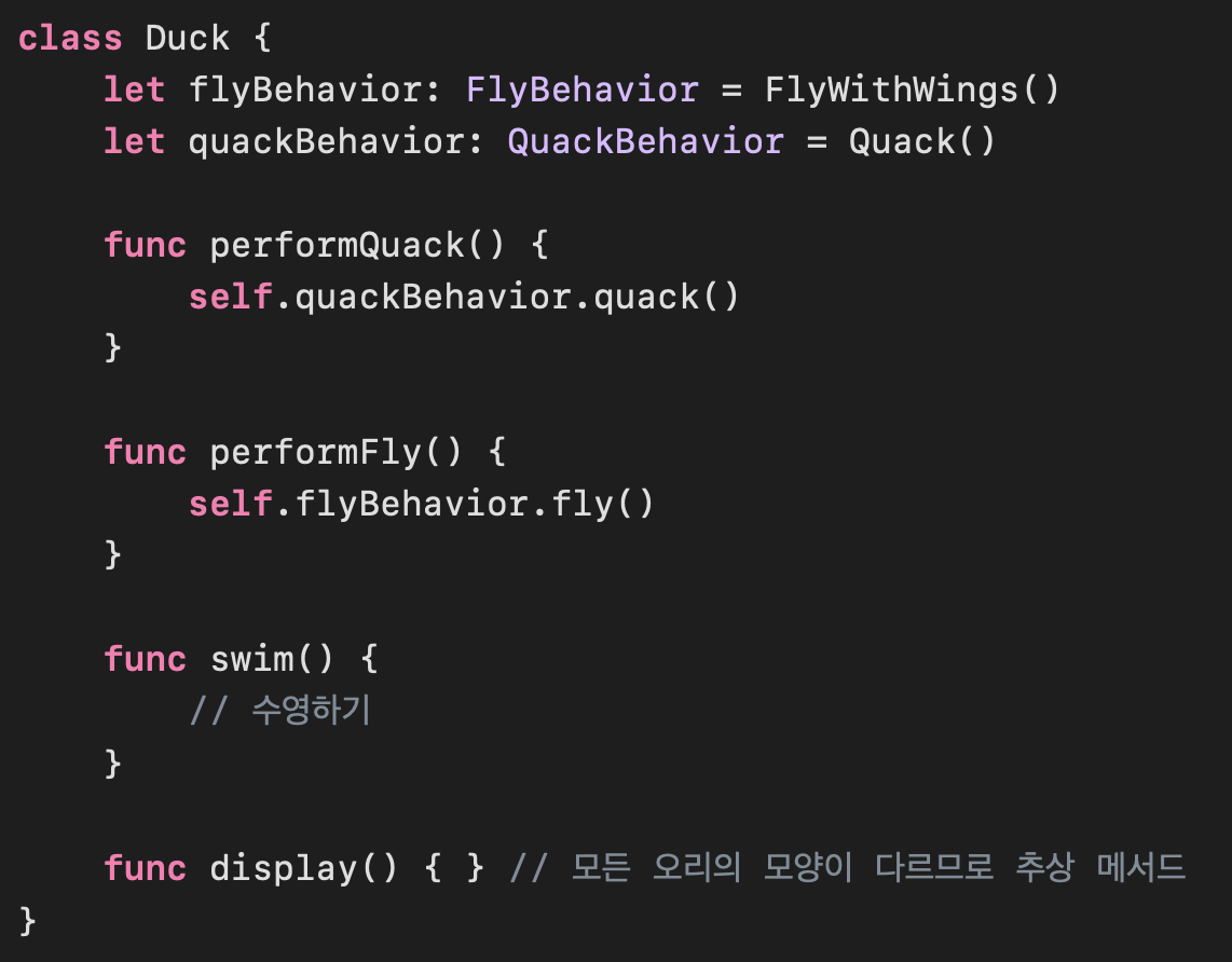 ๊ทธ๋ฆฌ๊ณ Duck ํด๋์ค๋ฅผ ๊ฑด๋๋ฆฌ์ง ์๊ณ ๋ ์๋ก์ด ํ๋์ ์ถ๊ฐํ ์ ์์ด์.