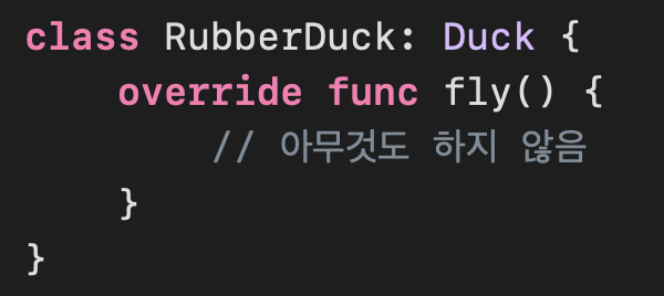 ๋ ์๊ฐ๋ ๋์์ ์กฐ๊ธ ๋ฐ๊พธ๊ธฐ ์ํด Duck์ ์๋ธํด๋์ค์์ fly ๋ฉ์๋๋ค์ ์ ๋ถ ์์ ํด์ผ ํ ์๋ ์๋ค๋ ๋จ์ ์ด ์์ด์.