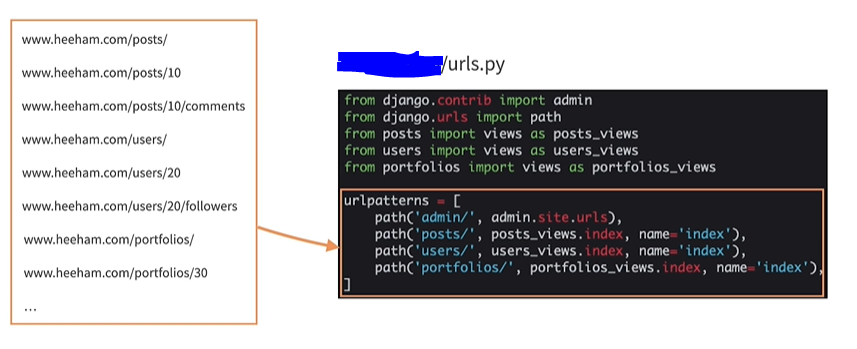 - urls.py는 request url을 받았을 때 어떤 뷰와 매핑 될 지를 결정해 주고, 이러한 이유로 여러 앱들에서 같은 이름의 여러한 views를 import해주어야 하는 문제가 발생한다. 또한 한 페이지에 존재하는 수많은 url 패턴들을 일일히 지정해주어야하는 문제가 발생한다.