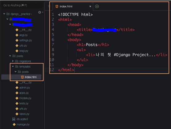 - 앱 내에 templates 폴더를 만든 후, 그 폴더 아래에 앱 이름과 같은 폴더를 만들어야 한다. 이름이 같아야 하는 것이 포인트이다.