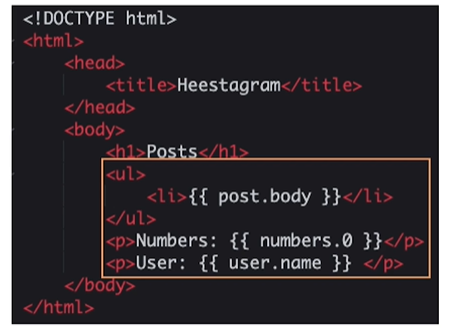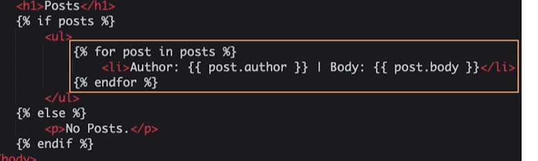 - html에서는 파이썬 문법을 이해할 수 없으므로 반복문의 마무리를 ;이 아닌 endfor로 해주어야한다. 반드시 적어주어야한다. 중괄호가 두개 겹쳐있는 곳이 우리가 실제로 눈으로 볼 수 있는 곳이다. {{ }}