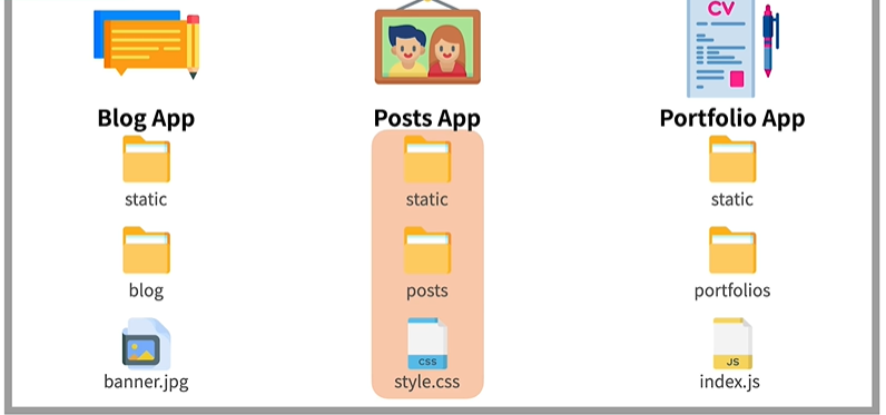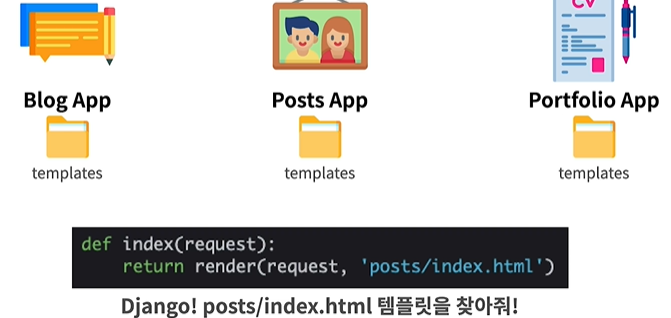 - Django는 template을 검색할 때 특정 app의 template을 검색하는 것이 아니라 전체의 templates를 검색하므로 예시의 경우 원하지 않는 app의 index.html을 가져올 수 있으므로 반드시 원하는 파일을 전달하기 위해서는 앞에 template의 특정 폴더를 지정해주어야 한다.
