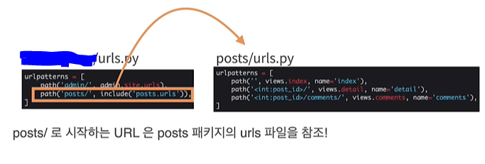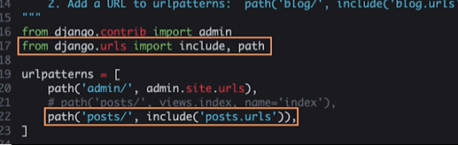 - 프로젝트의 urls.py에서 추가 설정을 해준다. path함수의 두번째 파라미터를 view 함수로 전달하는 것이 아니라 include 함수를 사용하여 posts패키지의 urls 파일을 포함시키고 있다. 이를 통해 url 설정을 앱단위로 분리해서 편리하게 개발할 수 있다.