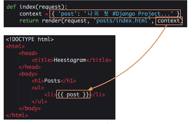 - render 함수 내에 3번째 parameter로 dictionary 형태의 요소를 넣으면 해당 요소를 출력할 수 있다.