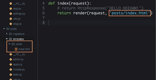 - render 함수의 2번째 인자에는 template이 위치한 경로를 전달해야하는데 장고는 기본적으로 templates 디렉토리를 기준으로 검색하게 된다.