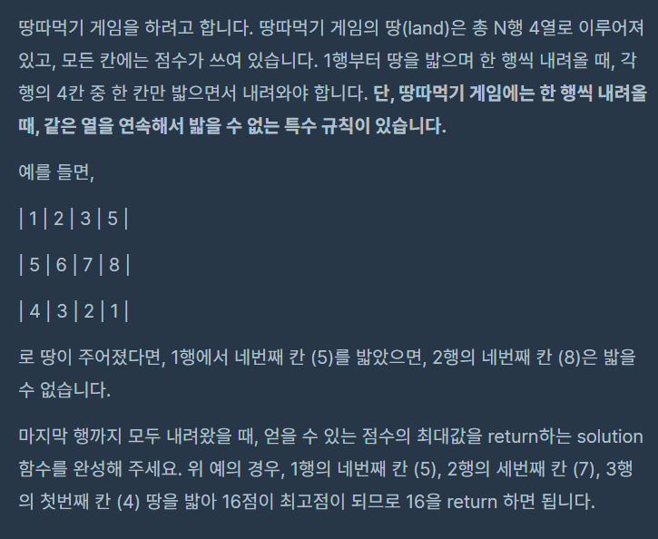 - 특정 row를 기준으로 특정한 col이 있을 때 바로 윗줄에서 그 col값을 제외한 값 중 가장 큰 값을 더해 저장한다.