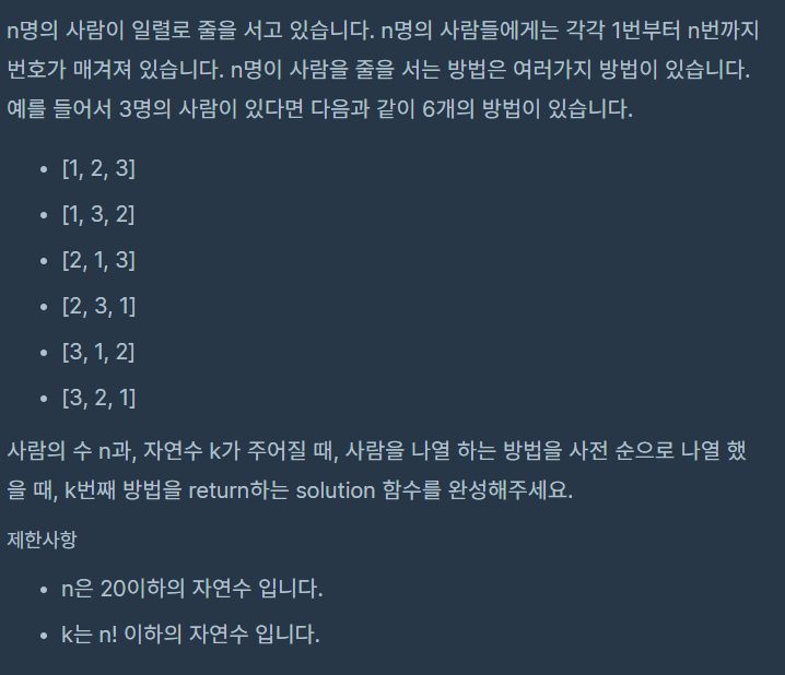 - permutation은 O(N!)의 속도를 갖기 때문에 permutation을 전부 계산하고 인덱스로 찾으면 속도 이슈가 난다. 그래서 수학적 계산을 해야한다.