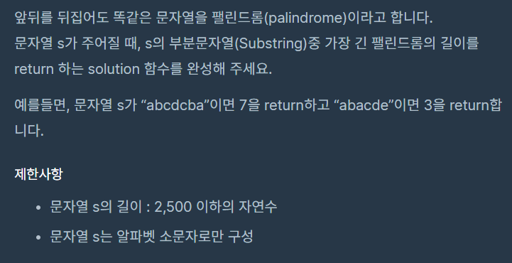 - 주어진 문자열 내에 존재하는 회문을 찾아 그 가장 긴 길이를 반환하는 문제이다.