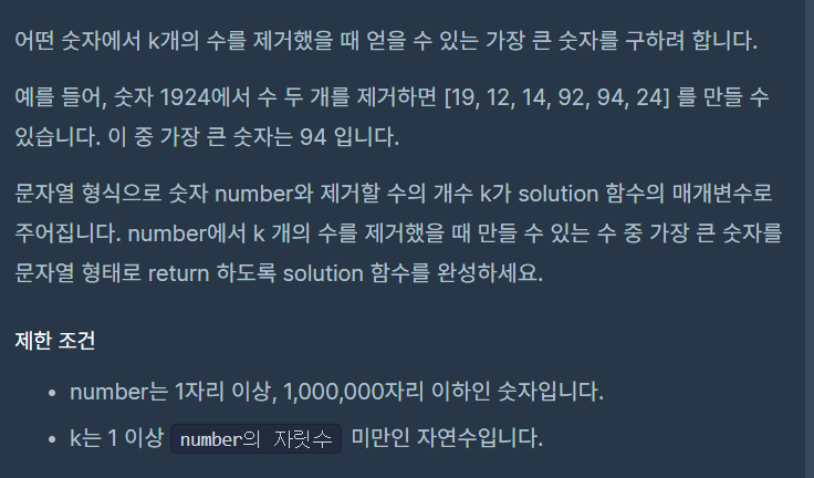 - 숫자 string과 제거할 숫자의 개수를 입력받아 숫자를 제거하여 얻을 수 있는 가장 큰 숫자를 찾는다.
