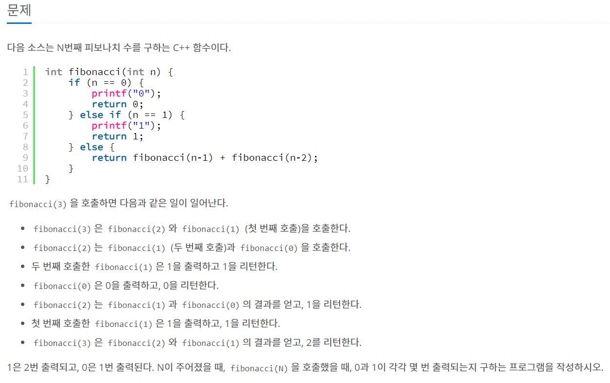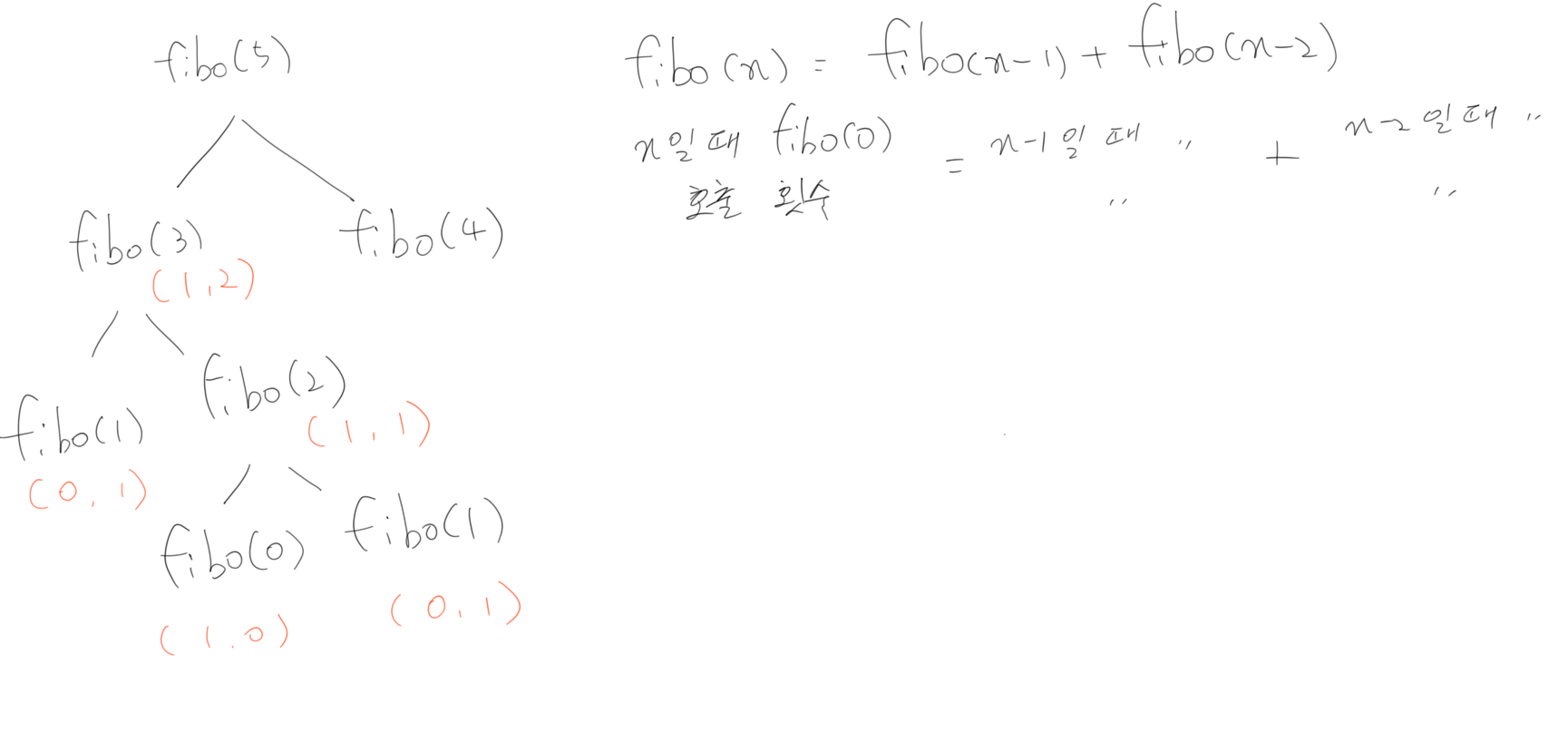 - 재귀를 사용하여 해당 fibo를 호출할 때마다 카운팅을 하면 중복이 발생하여 연산이 너무 느리고 시간초과가 된다. 캐쉬를 사용하여 dp를 쓰면 counting을 할 수 없다.